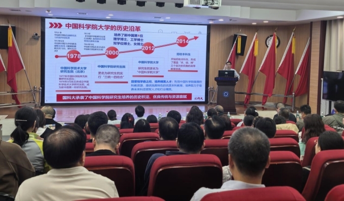 报告会气氛热烈,期间国科大2014级本科生曹晨风的家长自发来到现场,为国科大宣讲做经验介绍。他介绍儿子作为首届毕业生,在国科大物理专业打下了扎实的基础,后经历出国深造攻读博士学位,目前在港大工作。家长非常感谢国科大对孩子的精心培养,希望有更多优秀学子能来国科大深造。
