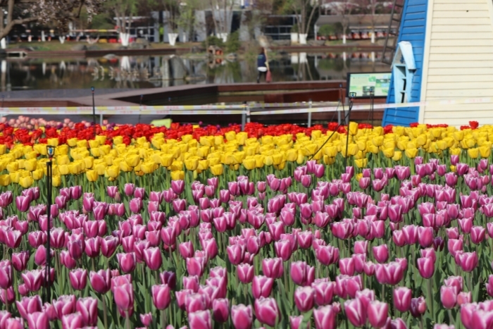 本届花展布展面积约为5000平米,郁金香作为本届花展的绝对主角,园区精选鹦鹉型、重瓣型、饰边型、百合型4大类30多个优质品种,涵盖红、黄、粉、紫、白、复色等多种色系,总栽植量达20万余株。其中,“人见人爱”“牛津精华”“水晶美人”等特色品种,或渐变晕彩、或流苏镶边、或稀有异色,全方位展现郁金香的品种魅力。展区主要分布在本草园、水景园、槭树园等区域,依托园区自然地形与专类园布局,打破了传统花田的单一布局,将郁金香的色彩、形态与园林艺术巧妙融合。为呈现最佳观赏效果,园区采用沉浸式园艺造景,沿水系打造“流动花境”,用不同品种及花色的郁金香搭配,按照早、中、晚品种相间种植,勾勒出蜿蜒的色带、起伏的花丘与精致的花境,每一处转角都充满惊喜,一步一景宛若油画,让游客从“看花人”变身“画中人”。