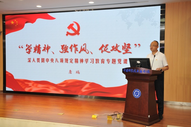 詹瑞以“学精神、强作风、促攻坚”为主题讲授深入贯彻中央八项规定精神学习教育专题党课。他以党中央开展深入贯彻中央八项规定精神学习教育的目的和内涵为切入点,结合党的作风建设历史发展与实践路径,用鲜活的实例讲述老一辈科学家的优良作风学风故事,进一步强调加强作风建设的重要意义,并结合违反中央八项规定精神警示案例对分省院党员干部职工提出“九个严禁”具体要求。