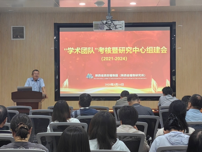 为系统总结过去四年(2021-2024)科研工作成效,优化整合科研力量,部署新时期创新发展任务,陕西省西安植物园于2025年9月16日上午在新区综合楼一楼报告厅召开2021—2024年学术团队考核暨研究中心组建宣贯会。园领导班子成员、各部门正副职及全体科研人员出席会议。会议由园务委员王宇超主持。